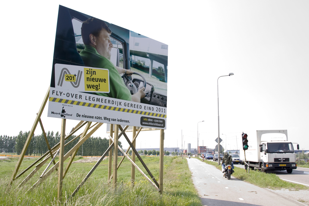 Opdracht: Tussen 2006 en 2011 heeft de provincie Noord-Holland gewerkt aan de N201, de provinciale weg tussen Aalsmeer en Uithoorn. TdH Design heeft de billboards langs de weg ontworpen waarop de werkzaamheden werden gecommuniceerd. TdH heeft gekozen voor de pay-off ‘De nieuwe N201. Weg van iedereen’, gecombineerd met foto’s van weggebruikers van de N201. Een positieve insteek voor een project waar weggebruikers vaak het negatieve van inzien. De campagne is voor iedereen herkenbaar, daar iedereen een gebruiker is van de N201.