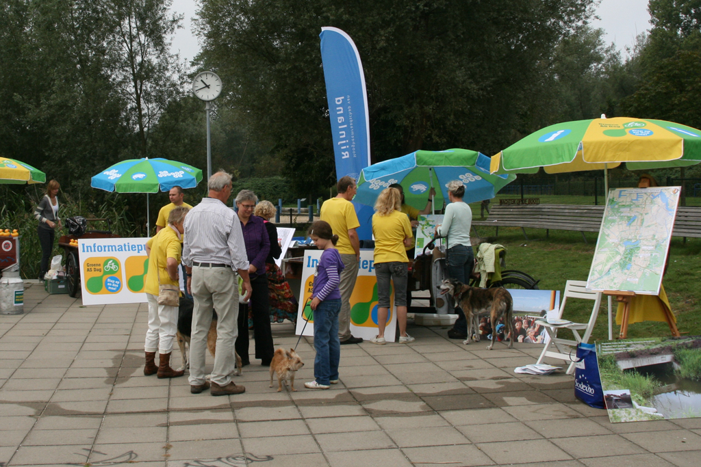 Het informatiepunt was opgebouwd uit vier bakfietsen waar de partners van de Groene AS eigen promotiemateriaal konden verspreiden. Daarbovenop werd algemene informatie over de Groene AS uitgegeven en werden gratis fietsbellen met kompas uitgedeeld. Een handig hulpmiddel om het noorden te duiden tijdens het fietsen van een Groene AS fietsroute. Rapporten, magazines, zadelhoesjes, sponsen, badeendjes en nog veel meer werden uitgedeeld aan fietsers en wandelaars. Een behulpzame passant daarbij was Pien de IJsvogel. Zij leeft in de Groene AS en liet menig recreant kennis maken met haar natuurgebied.