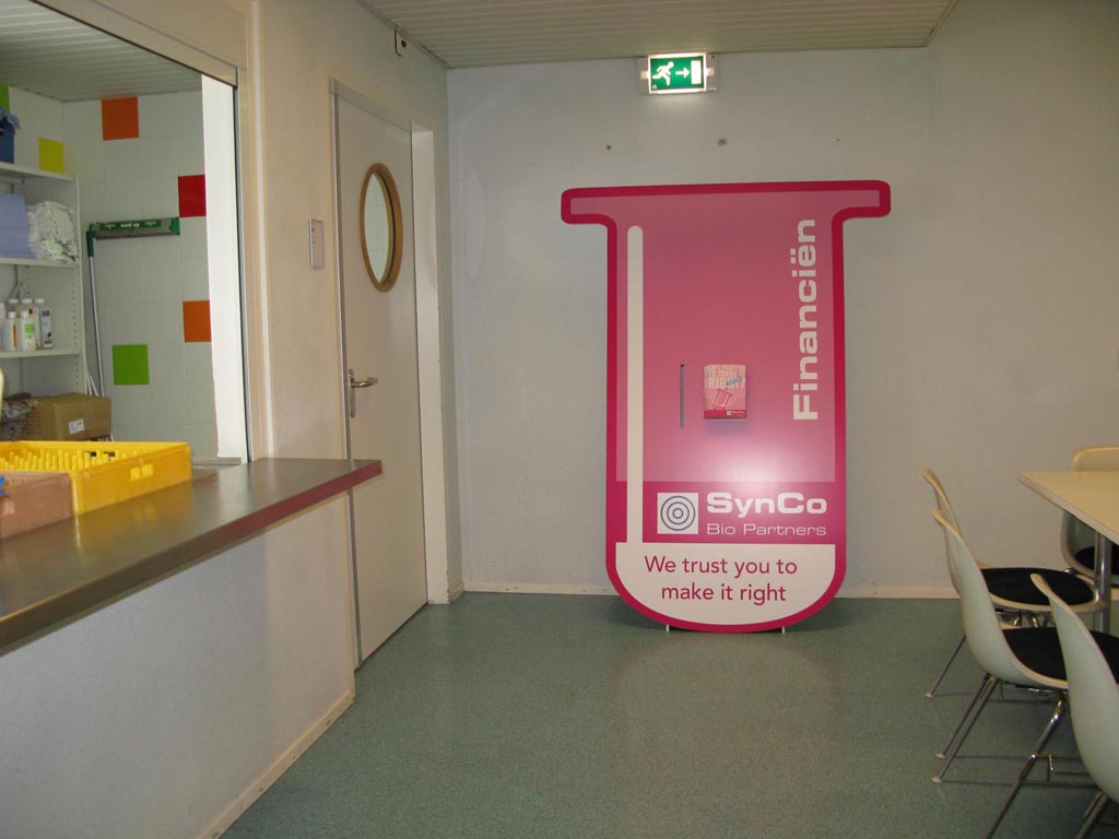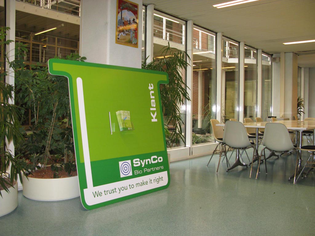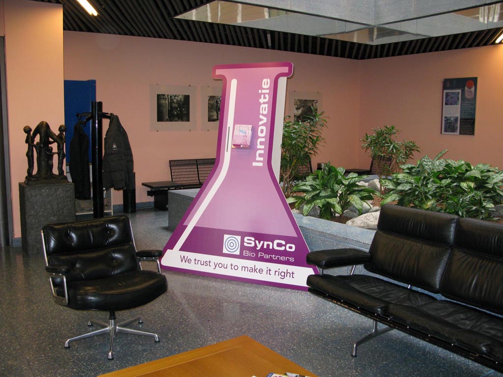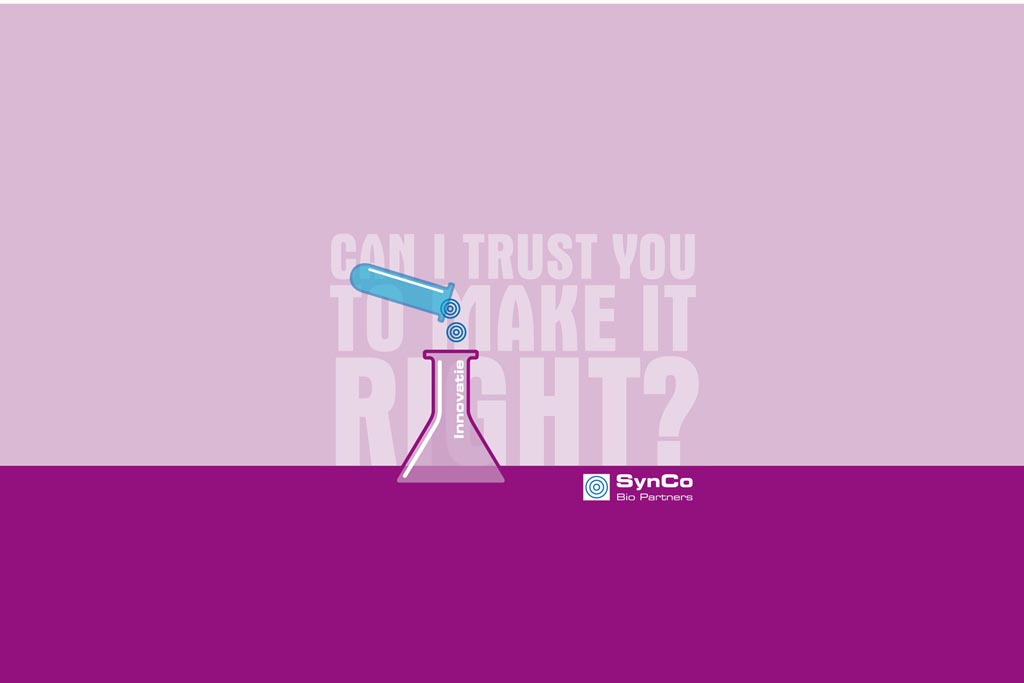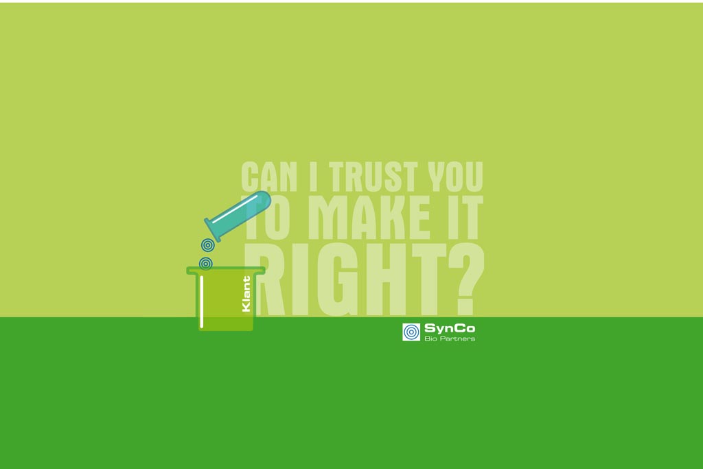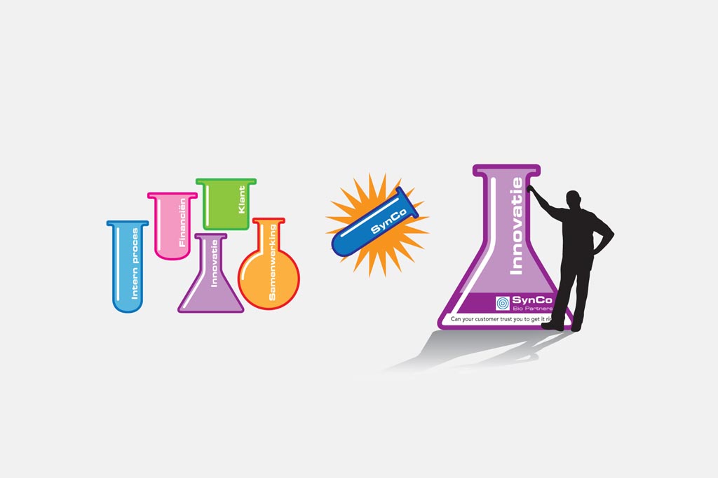Onder het motto ‘We trust you to make it right’ werden medewerkers uitgedaagd en geprikkeld om in een ideeënlaboratorium na te denken over en voorstellen te doen voor hun interne communicatie. Synco Bio Partners is actief in de biopharmacie. Passend bij de dienstverlening is de interne campagne vormgegeven rondom ellemeijers en reageerbuizen. Met frisse aansprekende posters, screensavers en gadgets werden de thema’s visueel gemaakt. De uitingen moesten uitnodigen en prikkelen om tot actie over te gaan. Namelijk ideeën aandragen aan de hand van vragen als Can I trust you to make it right, What do you need to make it right, How can YOU make it right en How can you help your collegues to make it right. Via reactieformulieren konden de medewerkers in de weken na de bijeenkomst hun oplossingen en feedback kwijt in grote ideeënbussen in de vorm van reageerbuizen. Deze displays stonden op prominente plekken in het pand, waardoor de campagne het gesprek van de dag bleef en de respons zeer hoog was.