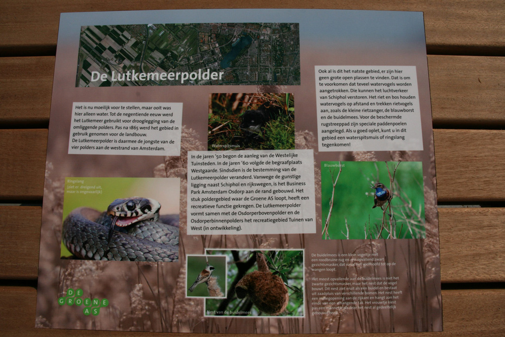 De informatiepanelen zijn leuk voor jong en oud. Op het grootste paneel wordt informatie over flora en fauna afgewisseld met een zoekplaat of een quiz. Op het middelgrote paneel is een overzichtsplattegrond van de Groene AS-zone te zien en welke dieren er leven in dit gebied. Op het kleinste paneel wordt uitgelegd waarom de Groene AS wordt gerealiseerd en welke organisaties de Groene AS mogelijk maken. De informatie bevordert dat mensen ommetjes maken en de natuur om de hoek ontdekken.