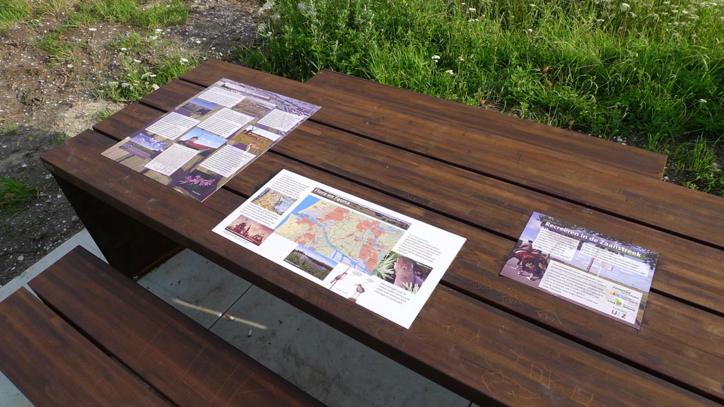 In de tafels zijn drie metalen informatiepanelen gelegd. Deze panelen zijn full colour beprint met tekst en beeld. De geprinte metalen platen zijn lichtecht en krasbestendig. Iedere tafel heeft een eigen thema. Eén tafel gaat over de ontwikkeling van het Zaanse landschap en vertelt het verhaal over het Noordzeekanaal, de havens en het pontje. Op de andere tafel is het verhaal te lezen over de wording van het Zaanse landschap: van industrie tot veenweide. Op beide tafels is ook een kaart geplaatst van het gebied waarop veenweidegebieden, de Stelling van Amsterdam en de Zaanse molens zijn aangeduid. Op een klein paneel op beide tafels is informatie geplaatst over recreëren in de Zaanstreek. De recreatietafels harmoniëren in het landschap en nodigen passanten uit om te genieten van het uitzicht.