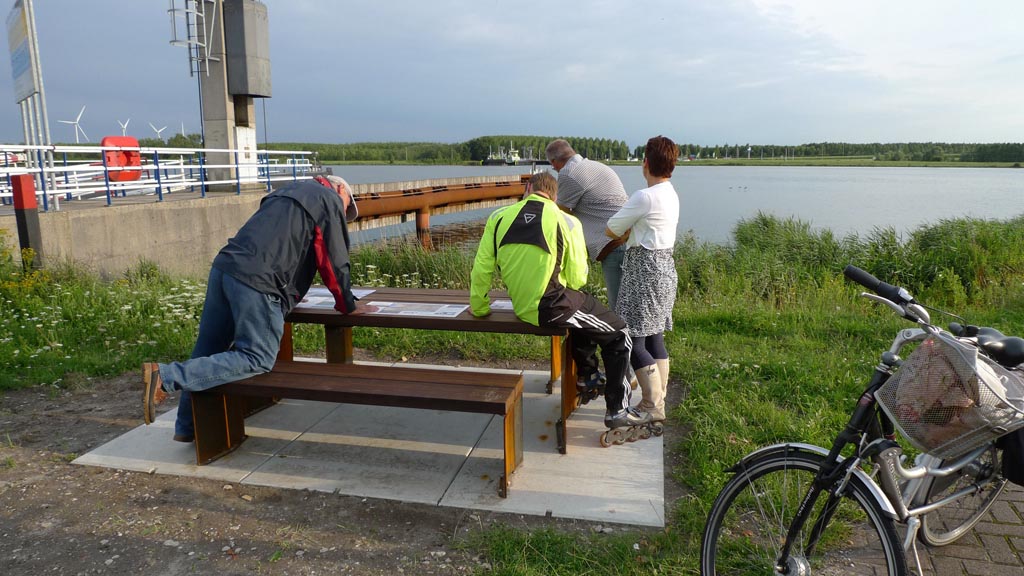 Opdracht: Een aantrekkelijk informatiepunt verzorgen bij Pontplein Buitenhuizen voor wandelaars, fietsers, voorbijgangers en andere recreanten. In de recreatietafels zijn informatiepanelen verwerkt zodat mensen meer te weten komen over het gebied en haar karakter.